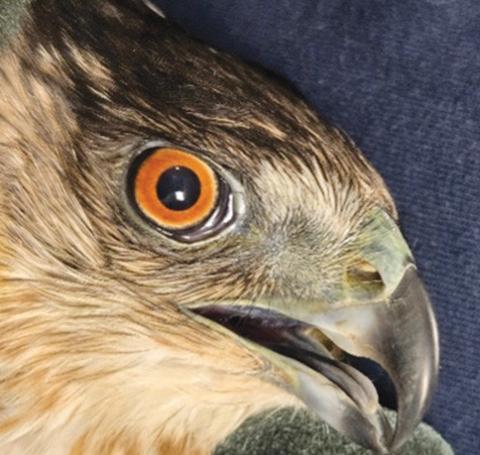 barring on its chest. These features, combined with a rounded tail, make the Cooper’s Hawk highly maneuverable, allowing it to navigate through dense vegetation effectively. Adult Cooper’s Hawks will have orange eyes, while immature ones will have yellow eyes.