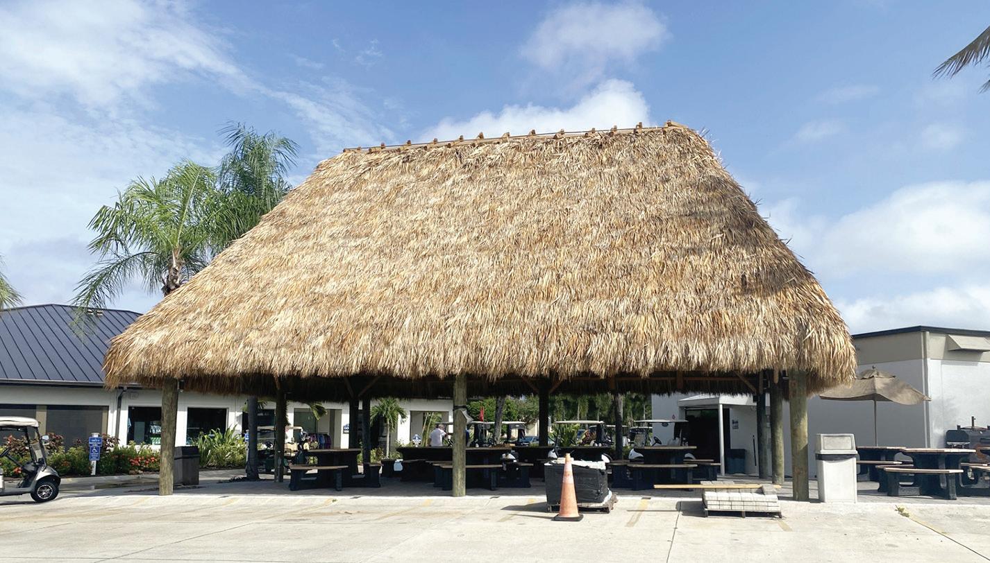 Hooray, the Tiki permits are in, and the Tiki Hut and Stage are up. What a unique asset to the Country Club. Without the fans in, the temperature under the Tiki is very comfortable. The lighting has been installed. The trees that were removed to install the tiki were used in the community. There is a landscaping addition behind Osprey 1 and Pelican 1, using palm trees from this area. White paving stones were placed along the perimeter of the patio along with solar paver lights that will alert members/guests of the slight step up into the Tiki Hut. The round tables from the far patio have been placed inside the Tiki, with the picnic tables moved to the other patio. We are currently working on ideas to enhance the additional patio with shade to fit into our outside theme.