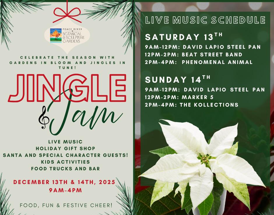 • Saturday, December 13 and Sunday, December 14: Jingle & Jam. Live music, holiday treats and lots of activities, including Santa. 9 a.m. to 4 p.m. Peace River Botanical and Sculpture Garden, 582 Riverside Dr. Fees, general admission, or free to members. Go to https:// peaceriverbotanicalsculpturega.ticketsprice.com/ jinglejam for pricing.