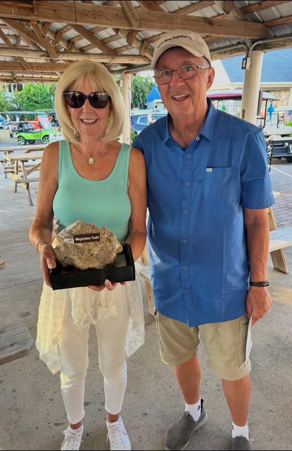 speak to the Anglers on the great efforts of Captains for Clean Water. Following Capt. Morris’s presentation, the Anglers held their Holiday Drawings. There were over 35 gifts contributed by members, guides, and local tackle shops. The gifts included fishing tackle, antique fishing lures, equipment and wonderful posters from Guy Harvey and Marine Fisheries. The grand prize was a 25-million-year-old Megalodon Shark Tooth embedded in limestone found locally. The tooth measured over 4 inches and was certified to be from a shark, possible over 40 feet in length. The winner was long time Angler members Kelly and Marilyn Webber.