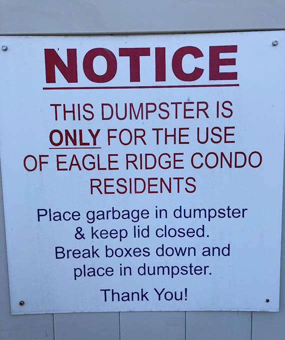 THE DUMPSTERS ON THE EAGLE RIDGE CONDOS PROPERTY ARE FOR CONDO PROPERTY OWNERS ONLY.
