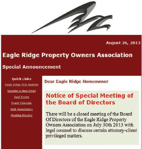 Each month the Eagle Ridge Property Owners Association sends out an email with reminders of activities at the Ridge. If this image looks unfamiliar to you, you are not on our email list.
