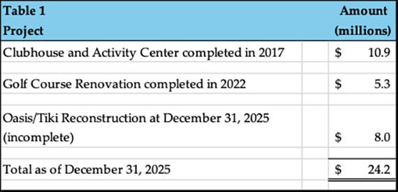 One important point about Table 3: it reflects available sources as of December 31, 2025. The Club will continue to receive resale capital contributions in 2026 and in future years. In addition, it is likely that some operating surplus funds will be allocated to the projects. This is especially relevant because the final Oasis/Tiki cost has not yet been determined and may exceed initial estimates. Construction projects and original budgets are not always close friends.