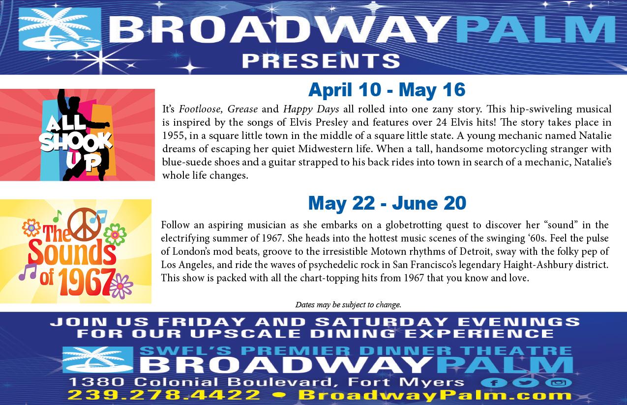 The Broadway Palm Dinner Theatre, 1380 Colonial Blvd., Fort Myers. 239278-4422. Check their website at https:// broadwaypalm.com/. for tickets for the following shows: