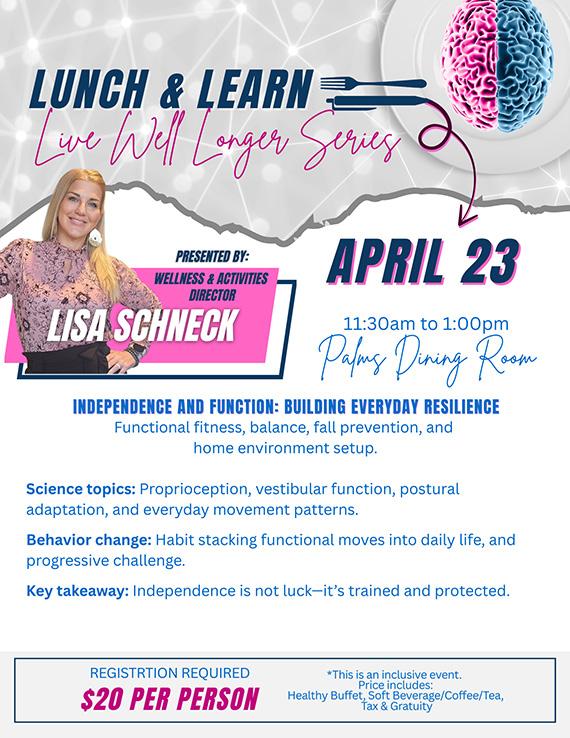 during the April 23 Wellness event: Independence and Function: Building Everyday Resilience . Come learn how everyday movement, awareness, and habit-building can help support resilience and independence for years to come. See below flyer for details.