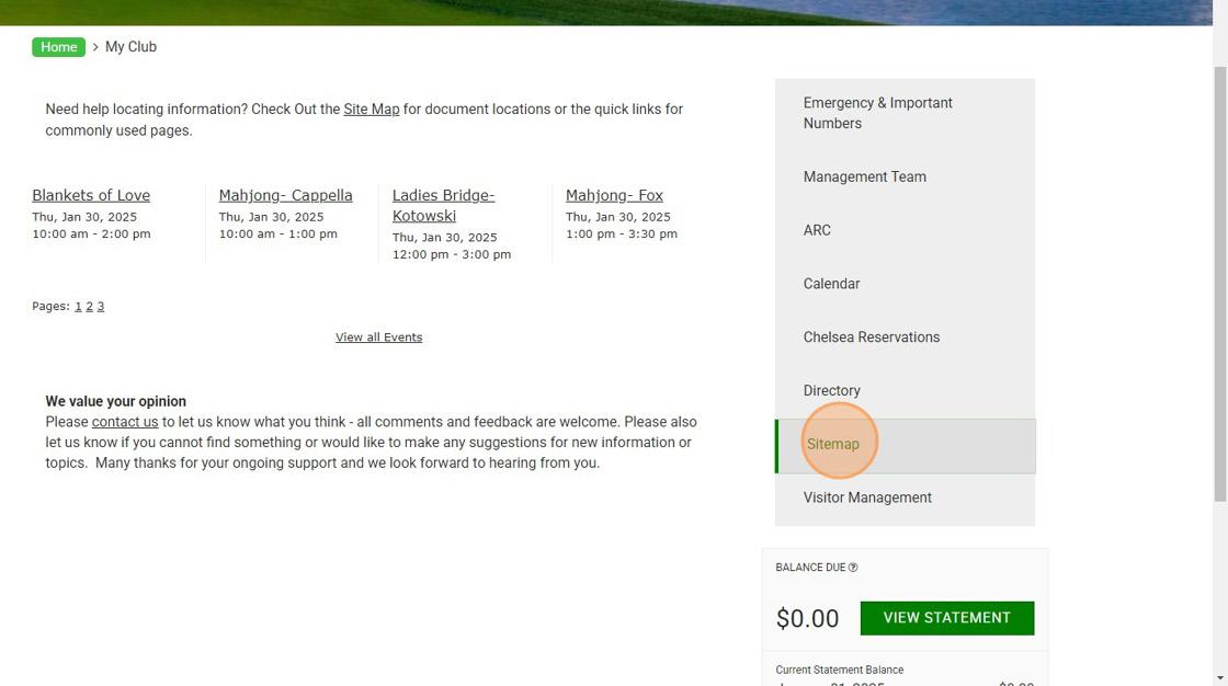 Once logged in, the Sitemap can be easily accessed by clicking on “My Club,” and then selecting “Sitemap.” See below.