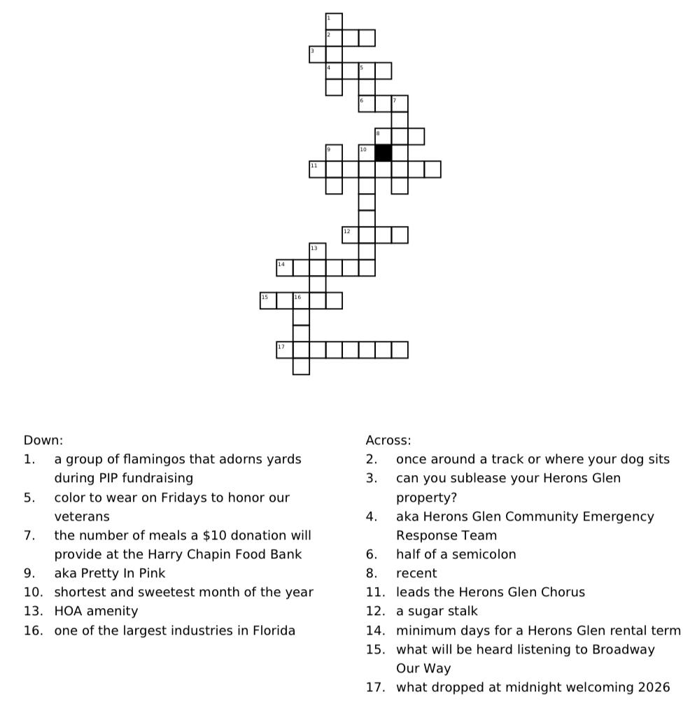 Christine Kozak is the committee liasion from the HOA Board of Directors. The Heron Editorial Policy is on file in the HOA office. Articles for The Heron may be dropped off or mailed to The HOA Office, 2250 Herons Glen Blvd., N. Fort Myers, FL 33917 or emailed to hgnewspaper@gmail.com