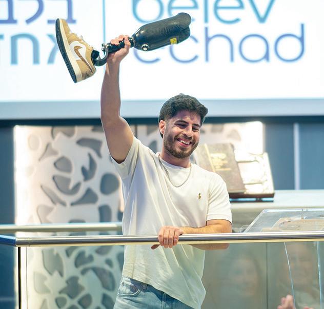 Rabbi Dovid Vigler introduced one of the wounded soldiers, who spoke about how he managed to survive the October 7 massacre. At the end of his speech, he pulled up his pants leg and showed the crowd that he was wearing a prosthetic limb, the same kind that are donated to wounded soldiers by Belev Echad. A second soldier shared his story of being a driver of an armored vehicle on October 7.