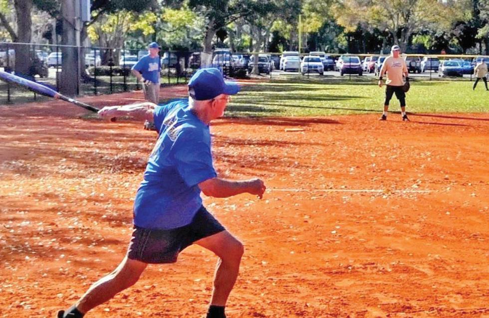 Veteran player Pollak, a seasonal resident from Livingston, N.J., turns 91 Feb. 11, making him the oldest player in the program. He is co-manager of a team, “Bruise Brothers,” and plays third base. A retired dentist, Pollak is in his 20th year playing in the league. When asked