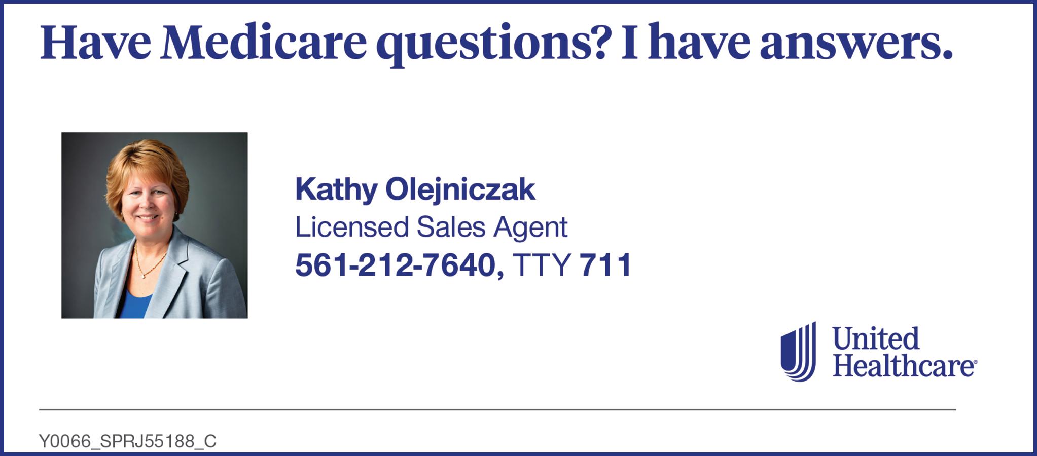 For your free Medicare plan review please call me, Kathy Olejniczak, agent, at (561) 835-5413 or cell/ text (561) 212-7640.
