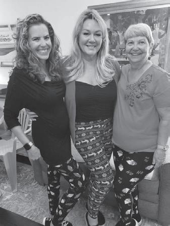 ladies Nastasha Benchimol, Jen Bavender, and CeCe Loper showing off their colorful Christmas leggings.