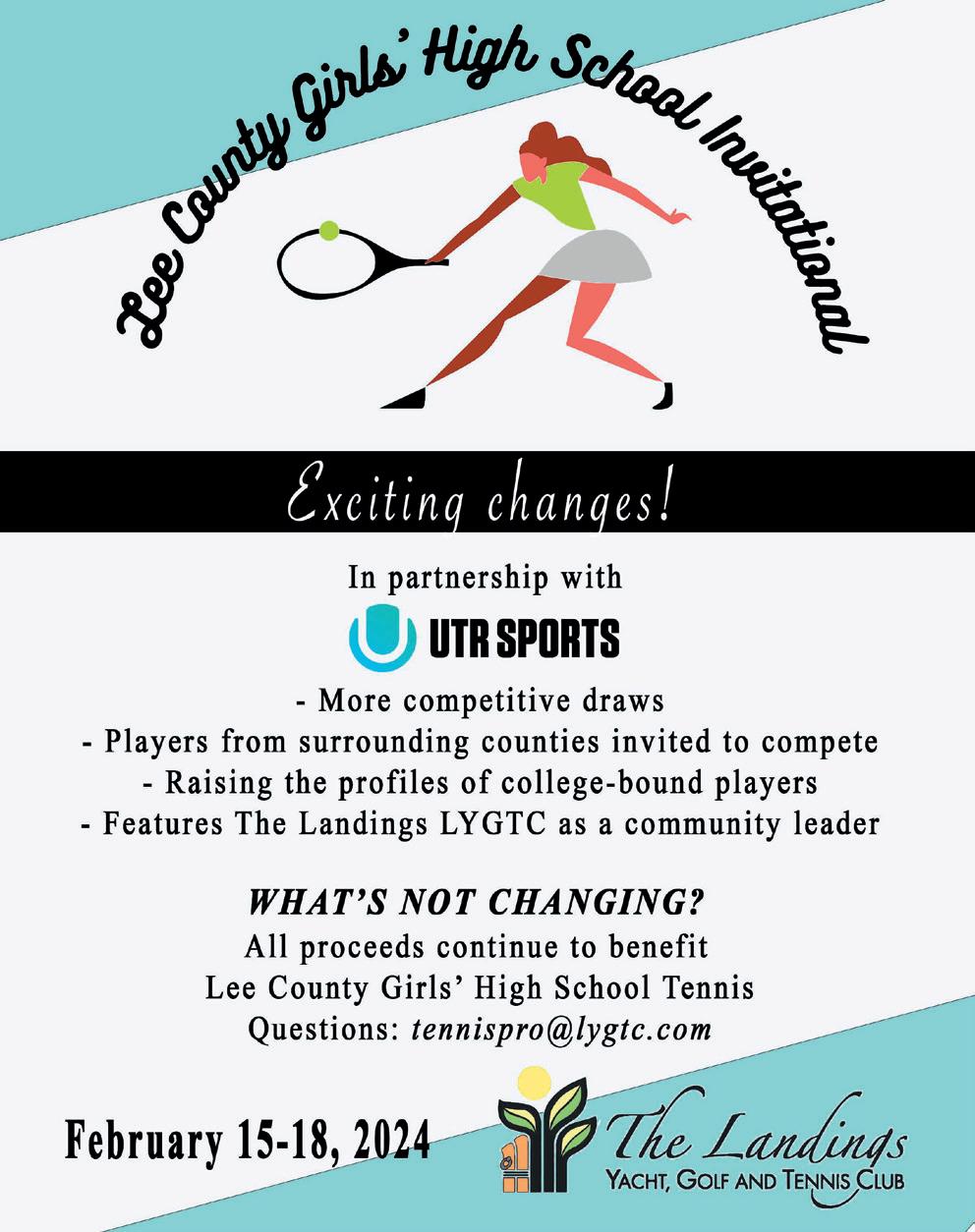 2024 – A Year of Transition and Growth – After discussions and review of the 2022 and 2023 tournaments, a decision was made that the Universal Tennis Rating System (UTR) was the perfect juncture of opportunity and support that met the goals for both The Landings community and the players. The UTR offers college recruiters a universal ratings invitational opportunity for competitive players to showcase their talents well beyond the local Lee County Public Schools. ONLY the Lee County Public Schools’ programs will continue receiving proceeds from the event.