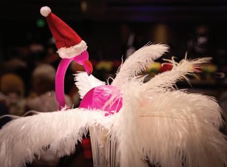 The party’s theme, Christmas in Paradise, was carried throughout the room and the decorations. Rather than the traditional red and green Christmas colors, Marilee Simon and her creative social committee “flocked” the room in pink flamingos wearing Santa hats. The table centerpieces were stunning feathery flamingos holding flamingo Christmas tree ornaments for each person at the table.