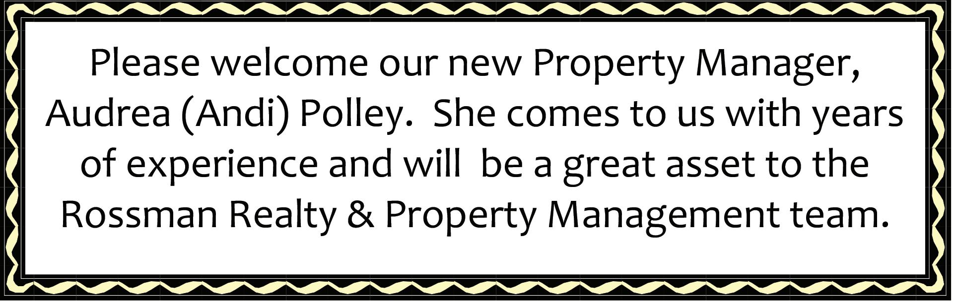Please welcome our new Property Manager, Andrea (Andi) Polley. She comes to us with years’ of experience and will be a great asset to the Rossman Realty & Property Management Team.