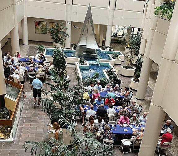 Originally the party was slated to take place outdoors on the 40,000 square foot recreation plaza, but the windy conditions forced the planners to move the event to Ariel’s spectacular 17-story atrium. Fortunately volunteers were readily available to move tables and chairs indoors so the party could proceed.