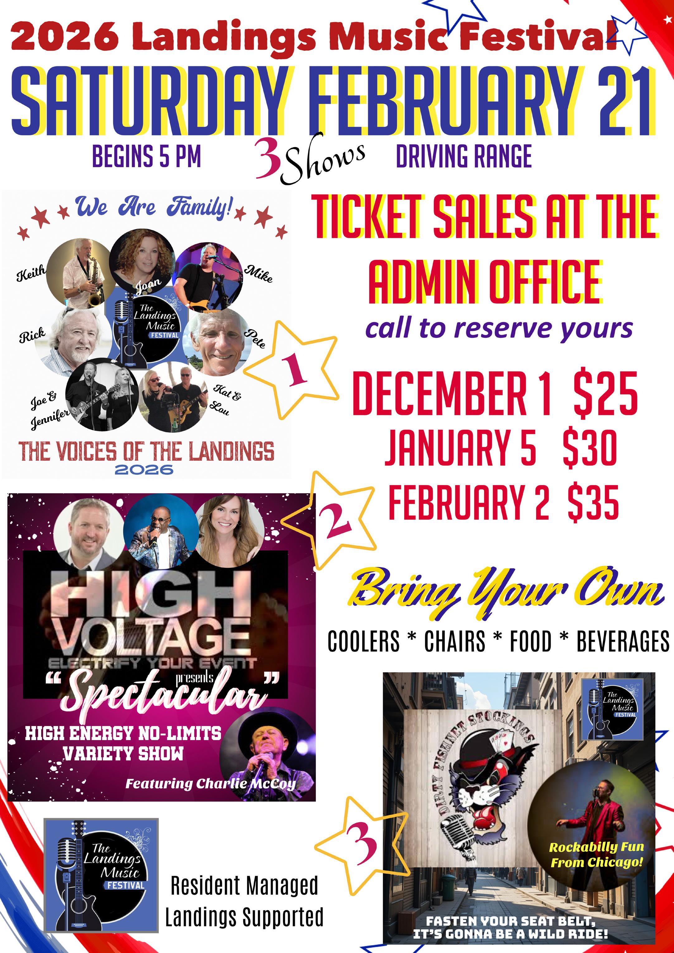 Three performing groups take the stage this year. “We are Family,” performed by Sister Sledge, became a gold record in 1979, and an anthem for caring and unity throughout the years. “We are Family” is also the theme for our opening performing group at the 2026 Landings Music Festival on Saturday, February 21, 2026. By the request of many in the community, show number one at 5 p.m., “We Are Family,” features nine resident vocalists with a variety of popular sounds and styles.