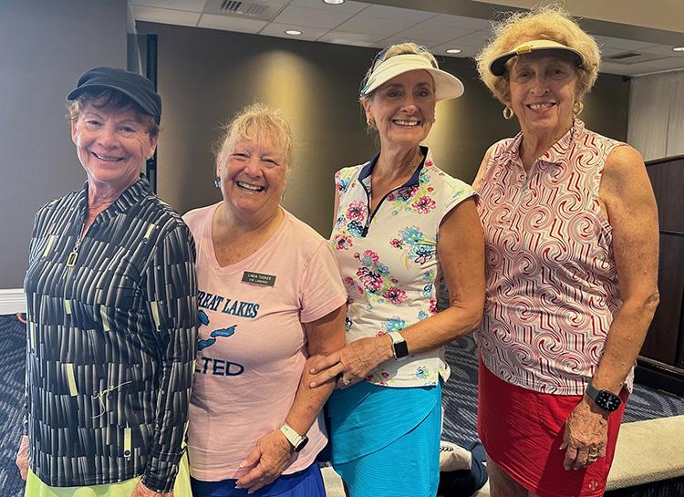There were some winners in all this activity and reporting first and second place teams from the scramble with the visiting ladies. In the first flight, first place was earned by the team of Karen Shelton, Barb Schulte, Kelly Wilson, and Lori Stegeman, second place: Phyllis Holley, Mary Ann Spry, Ginny Minarchi, and Mary Paulson.