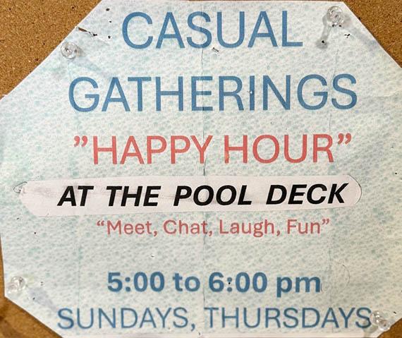 Due to inclement (understatement) weather, our February 1 brunch at the pool had to be cancelled. Although we might still be able to use the deck for our gatherings, our bathroom facilities and grills, the Thursday and Sunday night Casual “Happy Hour” might be in 4616/4612’s courtyard. If this alternative has changed, I hope you found all the fun!