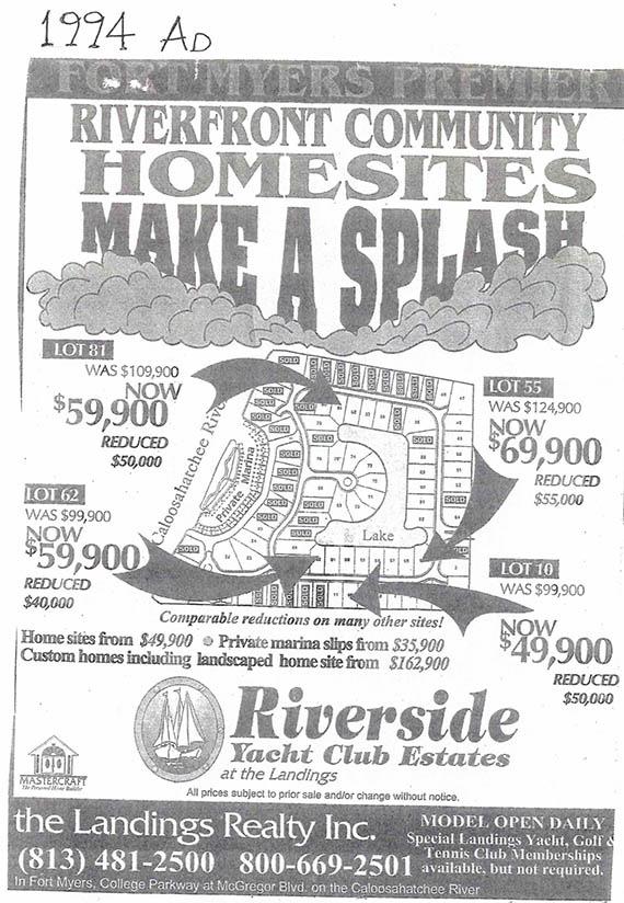 As promised in my first article, I want to reach back and get some “facts” about how Riverside and the neighborhood came to be. Check out the flyer on the next page and see if you can spot your lot. It is puzzling to me how some lots sold whilst others, that may have been considered superior lots, were not sold –especially at these bargain basement prices. Interesting to note that in 1994 you could purchase a lot for a price similar to what it would cost to have a pool installed today. Have a closer look at the ad and see what you would have paid for a house and a lot –not a lot!