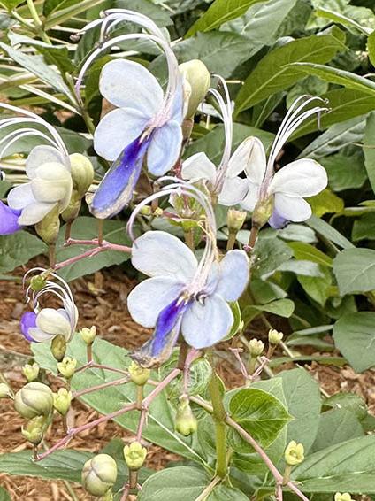 Walking along Flagship Drive near Lighthouse Village, I noticed a most exuberant flower with delicate blue flowers verging on violet. The stamens shoot out like a fountain! It is native to India, Sri Lanka and Malaysia. The plant is used in Ayurveda for snake bites. I challenge you to a flower scavenger hunt to find this one.