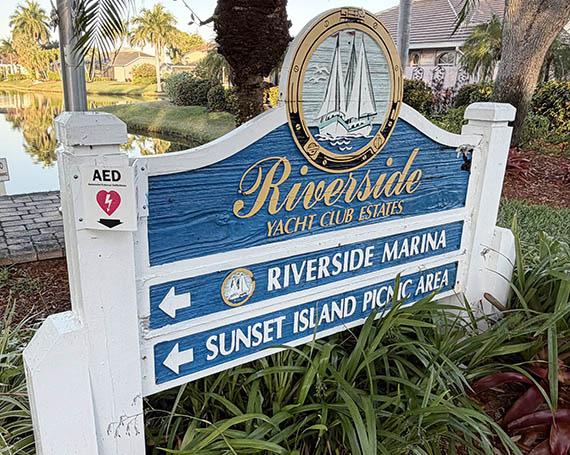 Another of Riverside’s “niceties” is reflected on the top left corner of the entrance sign shown in the photo below. The red image denotes the availability of a community AED, which is an Automated External Defibrillator. Others can be found throughout The Landings, and they are used to help anyone experiencing sudden cardiac arrest. It’s a sophisticated, yet easy to use, medical device that can analyze the heart’s rhythm and, if necessary, deliver an electrical shock, or defibrillation, to help the heart re-establish an effective rhythm. The actual AED is on the back of the sign. Check it out next time you pass by the entrance sign!