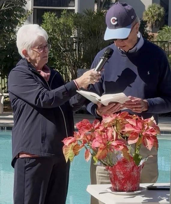 It was a chilly morning, but the sun helped warm our hearts as we celebrated the life of Dick Weller by the pool. Dick was known for his laugh and quick smile, his work as a farmer in Illinois, and several civic jobs in the off season. Armella’s daughter Kim shared beautiful memories from Dick’s life. The celebration was attended by Armella’s family and friends. Before Tom Rogers read John Donne’s poem, For Whom the Bell Tolls , he explained that when it was written in England during the Plague, the churches would ring their bells when a person died.
