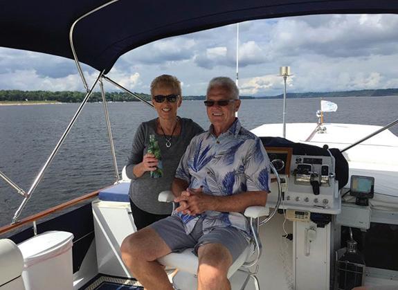 JANE AND PETER DAHLIN ENJOYING A ST. CROIX RIVER CRUISE ON THEIR BOAT.