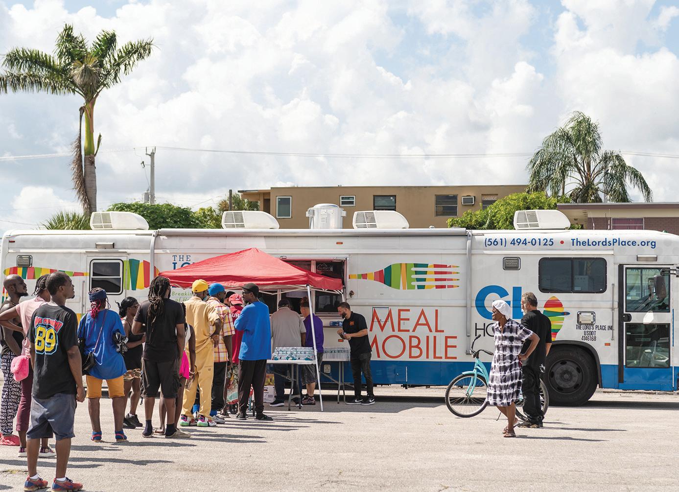 Individuals experiencing homelessness receiving hot meals from the Meal Mobile at its feeding site in Belle Glade. Photo credit: Downtown Photo