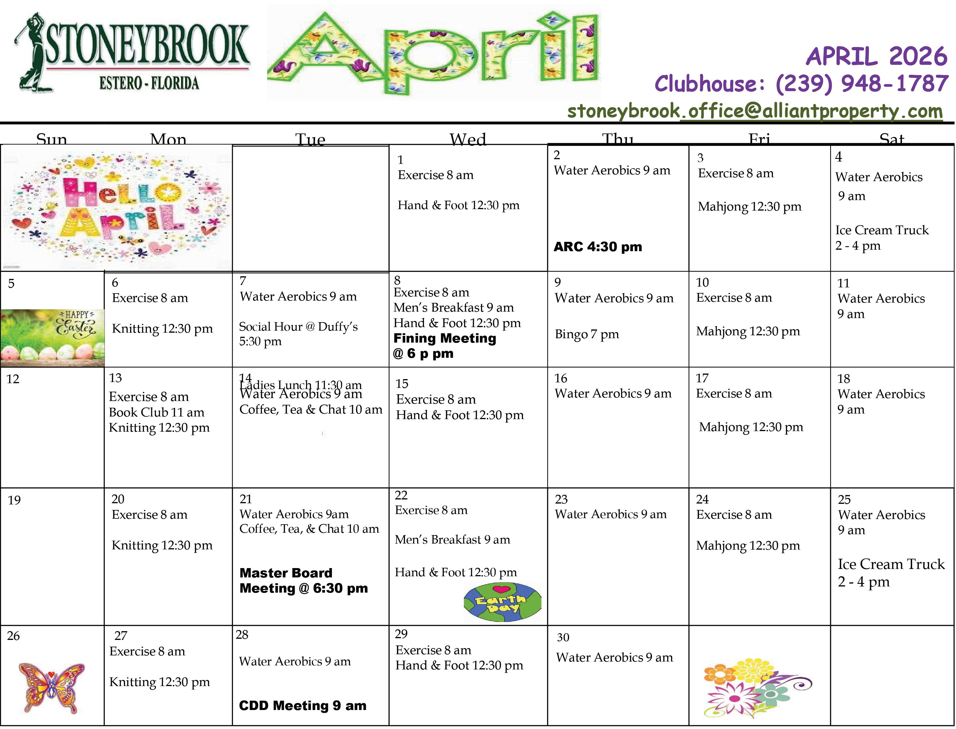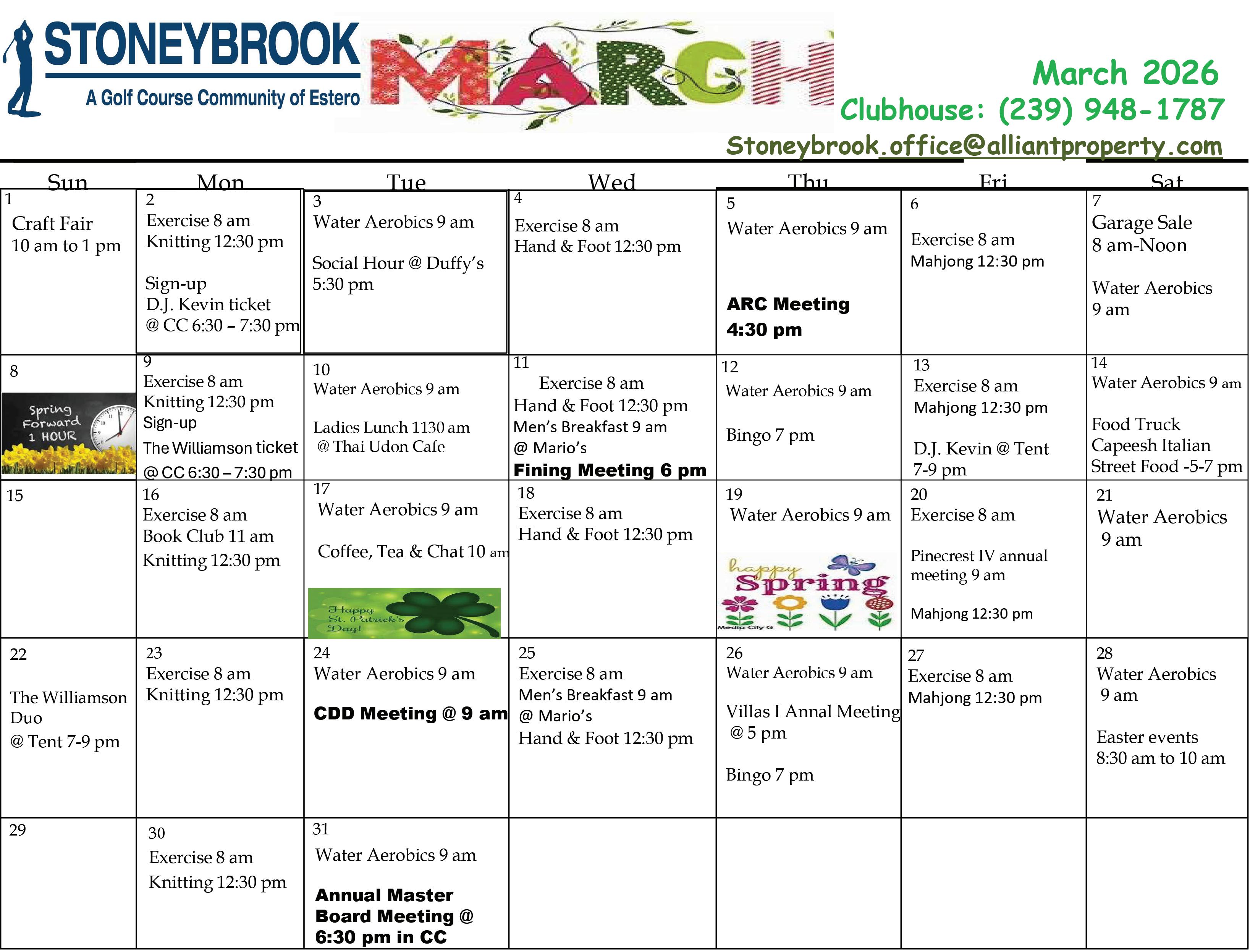 The Board of Supervisors meets at 9 a.m. on the fourth Tuesday of the month in the Community Center. Exceptions are: November and December held on the second Tuesday because of holidays, and February, May, June and August held at 6 p.m. Meetings are open to all community members. Agendas, minutes and other information can be found on the CDD website: www.stoneybrookesterocdd.com.