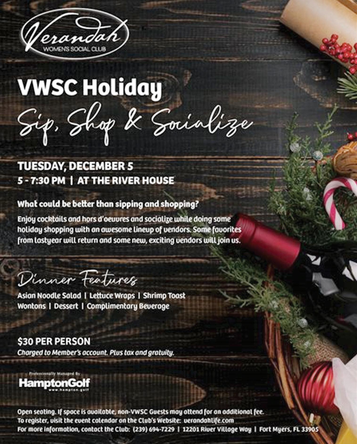 If it’s last-minute holiday shopping, plan to attend the Verandah Women’s Social Club Sip, Shop & Socialize on Dec. 5.