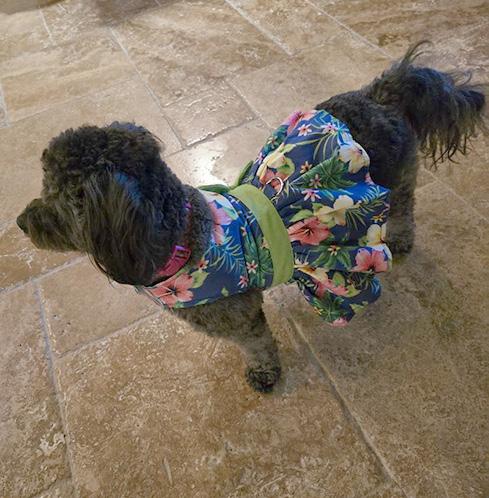 Peggy Sue is very people oriented and loves to meet and greet you on her walks, and she insists on being acknowledged, especially when she is sporting her new dress. Tres chic!