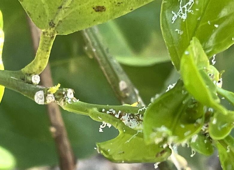 LEAVES ON CITRUS TREES SHOW PSYLLID (THE INSECT THAT SPREADS CITRUS GREENING) ACTIVITY.