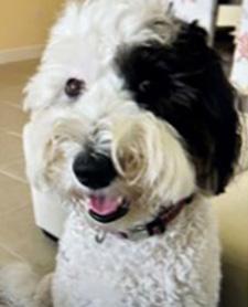 The adorable Lizzie catches your eye with her warm smile and interesting markings. Lizzie is a 2 year, 7 month old “F1” sheepadoodle (first generation offspring from a purebred Old English Sheep Dog mother and Standard Poodle father). This Southern beauty who was born, raised and trained in North Carolina, loves her daily exercise strolling around the neighborhood and running and playing with other dogs. Lizzie is a “regular” at the Verandah Big Dog Park. She can perform a small set of doggy tricks such as the usual sit, lie down, shake paws etc. but otherwise is more interested in activities involving “protecting us” (barking at any movement outside), and anything