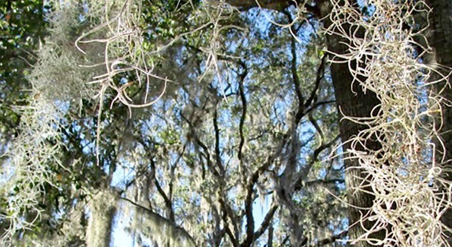 Spanish Moss is not a moss nor is it Spanish, as its name implies. It is a flowering epiphyte or air plant and is a member of the bromeliad family, a relative of the pineapple. It was so named by French explorers who thought it resembled the beard of Spanish conquistadors. Over time, it gained other nicknames such as grandfather’s whiskers, graybeard and tree hair.