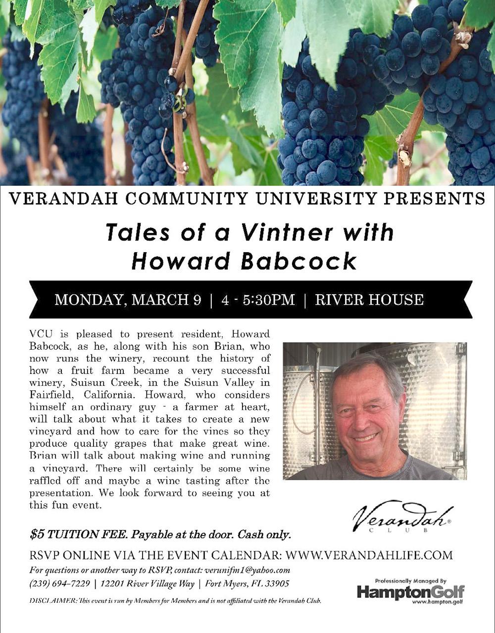VCU is pleased to present resident, Howard Babcock, as he, along with his son Brian, recount the history of how a fruit farm became a very successful winery, Suisin Creek, in the Suisun Valley in Fairfield, California.