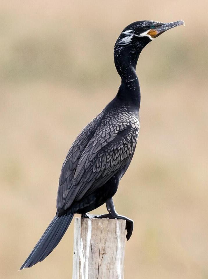 The cormorant is a large, dark-colored bird with a long neck and a hooked bill. Adults have a distinctive bright orange patch of skin around the face and brilliant blue eyes. Their neck is shorter and thicker than an anhinga. They are typically dark all over, often with a yellowish gular pouch—a specialized expandable area of skin found on the throat.