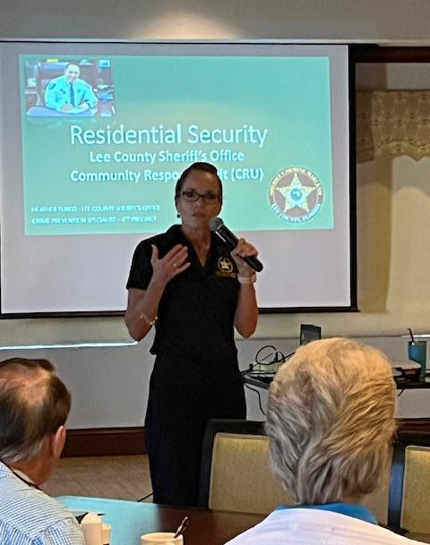 While most of us know the basics of home safety, it was pleasant and informative to hear Sheriff Representative Heather Turco remind us of them. And we learned some new things as well. The Residential Safety–How to Deter Thieves presentation took place on Tuesday, October 15 at the clubhouse. Approximately 35 residents attended. The presentation focused on our homes, valuables, vehicles, and neighborhood contacts. Among the tips were: