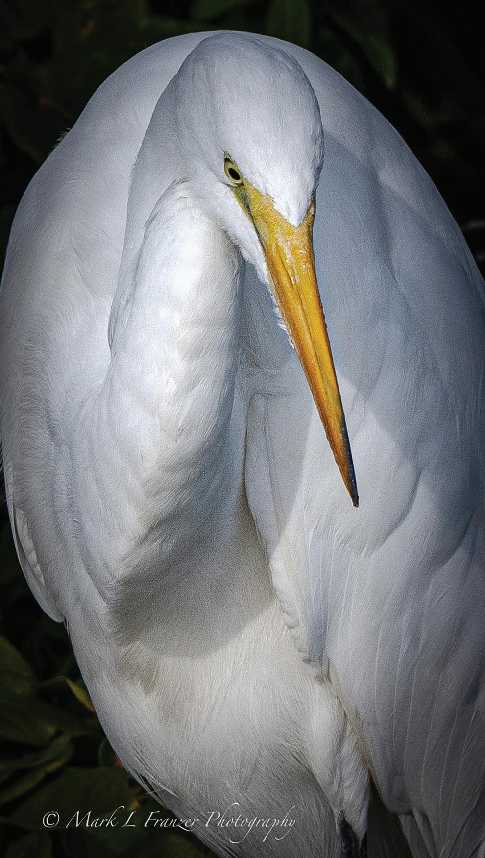 The great white egret ranks among our most conspicuous and beautiful birds. The great white egret is extremely similar to the great white heron, however, the egret is a bit smaller in size with black legs. The heron is larger in stature, less “bright” with a thicker bill and possesses pale grayish yellow legs. Great egrets are 3 feet long from bill to tail and slightly over 3 feet tall. They have a wingspan of almost 5 feet and weigh only about 2 1/2 pounds. The life expectancy of the egret is around 15 years, however, known egrets in captivity have reached upwards to 22 years! Great white egrets are wading birds, with their long legs suited for shallow water (fresh and salt) hunting of fish, frogs and other small aquatic animals. They typically stand extremely still and watch, waiting for unsuspecting prey to pass by. With startling speed, the egrets strike with a jab of their long neck and bill sometimes even spearing their prey!
