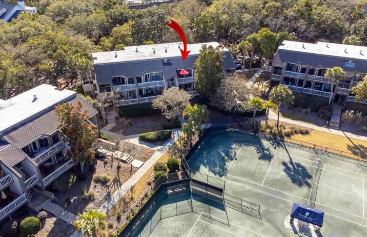 Well-maintained second-floor condo overlooking the tennis courts in the desirable Courtside Villas. This light-filled unit features an open floor plan with vaulted ceilings in the living room, a dining area, and an open kitchen. Each of the two bedrooms offers access to a full bath, a private deck, and a screened porch for added living space. Enjoy views of the tennis courts from the rear deck. Additional features include covered parking, a lockable storage closet, and a community pool. A new HVAC system is being installed in March 2025. Located across from The Lake House wellness center and just a short bike ride to Bohicket Marina and Freshfields Village via a scenic walking/biking path. OFFERED AT $376,000 | 2 BR | 2 BA | 1,026 SF | TENNIS VIEW 1614 Live Oak Park