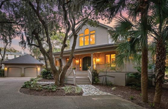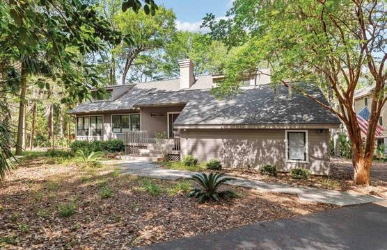 This custom Lowcountry home showcases thoughtful craftsmanship and effortless indoor-outdoor living. From the inviting front porch to exposed beams, columns, and detailed gables, every element is intentional. Inside, walnut floors, ceilings, and built-ins create warmth, complemented by shiplap and light cabinetry for coastal appeal. The vaulted great room opens to the rear deck and elevated plunge pool through expansive accordion glass doors, while a three-season sun porch features remotecontrolled screens and windows. The gourmet kitchen includes Bosch stainless appliances, double ovens, a six-burner gas cooktop, wet bar, and walk-in pantry. The main-level primary suite offers a spa-inspired bath and custom closet. Upstairs, a loft, office area, and two ensuite bedrooms await. Below, a conditioned four-car garage provides generous storage. Outdoors, enjoy a heated and chilled plunge pool, fire pit, outdoor shower, and serene wooded views.