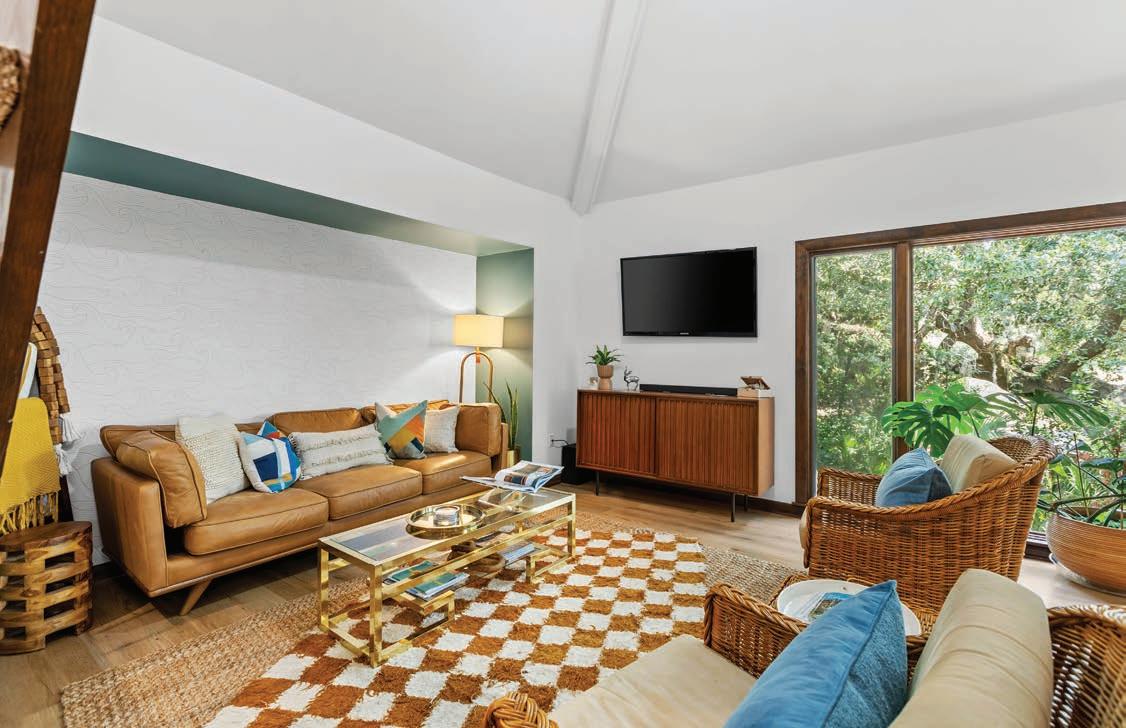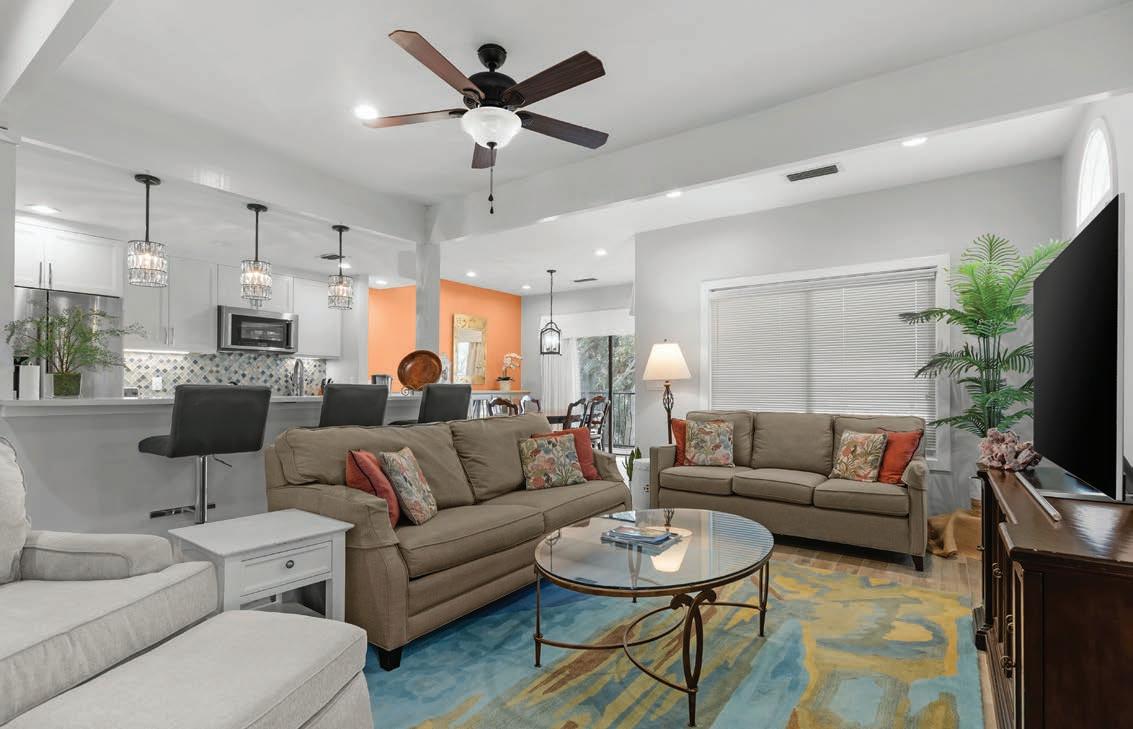 Welcome to a rare blend of vintage charm and modern style in this reimagined Seabrook Island beach villa. Inspired by 1970s California design, this two-bedroom, two-bath townhome is steps from the beach, Beach Club, pools, and oceanfront dining. Inside, vaulted ceilings, walls of glass, and layered textures create a bright, inviting space. The open living area features mid-century touches, bold wallpaper, and a playful bar perfect for entertaining. The dining area feels like a treehouse retreat, while the updated kitchen shines with granite countertops, fresh cabinetry, and stainless steel appliances. Enjoy al fresco dining on the expansive deck, or retreat to the coastal-inspired guest room or serene primary suite with a private balcony and spa-like bath. Every detail reflects effortless, laid-back luxury.