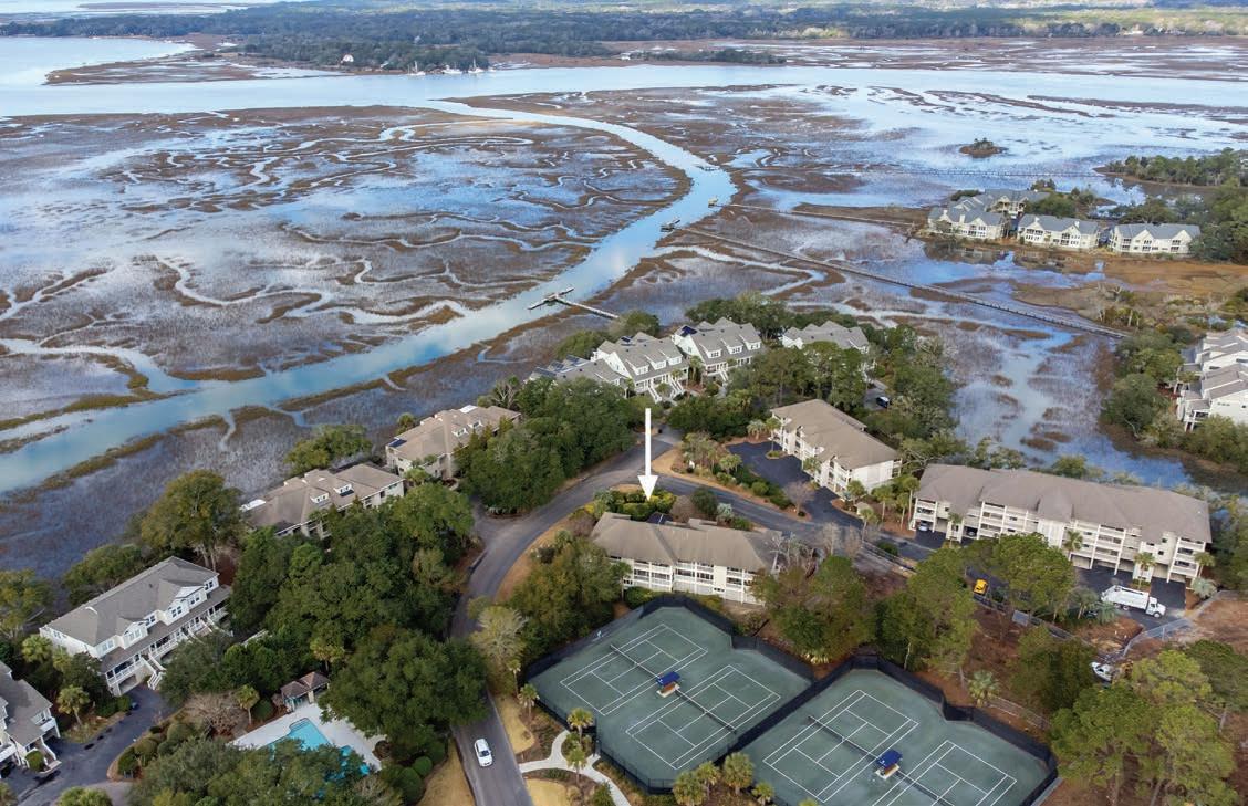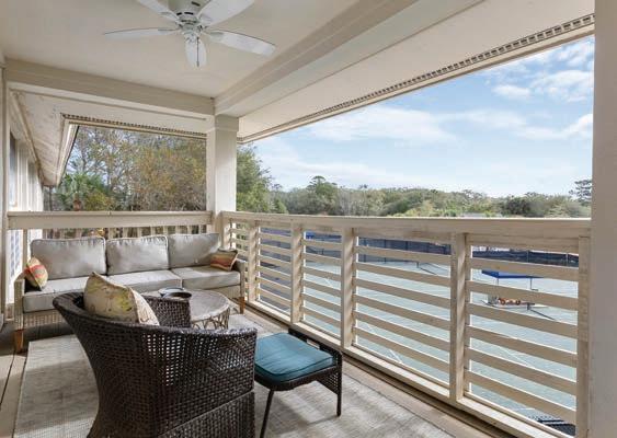 Updated top-floor Racquet Club condo with serene marsh and tidal creek views. Meticulously maintained and sold fully furnished (excluding personal items), this move-in-ready townhome offers privacy and quiet. The stylish kitchen features stainless steel appliances, granite countertops, subway tile backsplash, shiplap ceiling, and a breakfast bar that opens to the main living area. The first floor includes an open-concept layout and powder room, with a screened porch perfect for relaxing or dining outdoors. Upstairs, two spacious bedrooms with vaulted ceilings each offer private porches and en suite baths. Additional highlights include in-unit laundry, ample storage, covered parking, and access to the Racquet Club’s private pool.