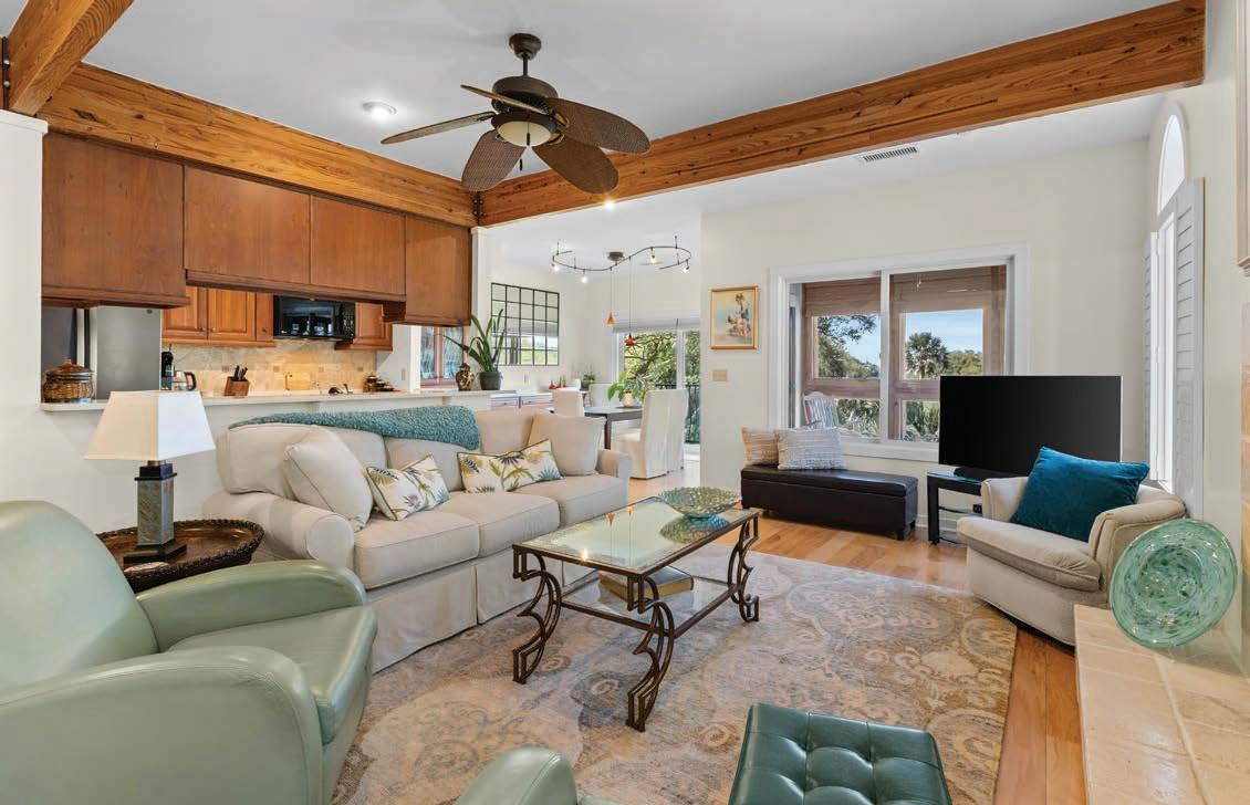 Welcome to your slice of island life on beautiful Seabrook Island. Full of coastal charm, this 3-bedroom, 2-bath home offers comfort, space, and an ideal location just over a mile from the beach and Club amenities. The open living and kitchen area flows easily for gatherings, while the sunroom—brightened by skylights and walls of windows—frames tranquil views of moss-draped oaks and the golf course. Both bathrooms feature modern walk-in showers, and the spacious primary suite opens to a private deck perfect for morning coffee or evening relaxation. Outside, enjoy a large yard with patio, grilling area, and a detached two-car garage for beach gear and bikes. Whether a full-time residence or vacation retreat, this home embodies the relaxed elegance of Seabrook Island living.