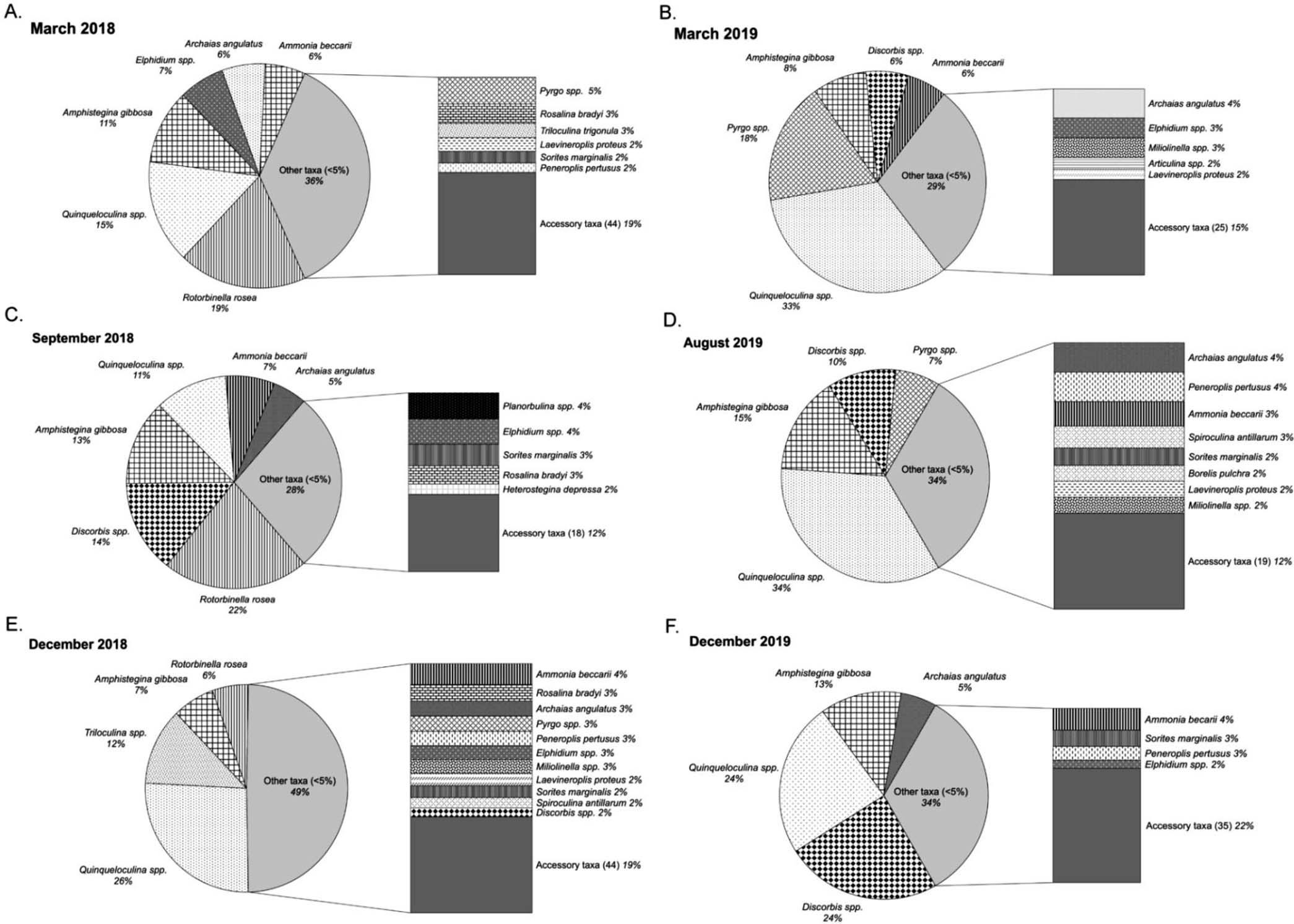 FIGURE 2.Relativeabundancesinback-reefsitesbymonthandyear:A)March2018,B)March2019,C)September2018,D)August2019,E) December2018,andF)December2019.Thepiechartsshowtaxawhoserelativeabundanceswere