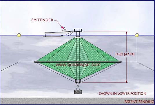 Island, Puerto Rico in 28-m deep water with each cage top submerged 8 m below the surface. The frame of the growout cages consists of a central spar, surrounded by a round steel rim 25 m in diameter. The rims of the two-growout cages were separated by about 30 m. Each frame is covered with taut netting attached to spoke lines conforming to the Sea Cage’s shape. Zippered doors in the net provide easy diver access. The cage system can be lowered and raised by varying the buoyancy of the spar and lowered or raised in less than 5 min. The cage can be lowered when a hurricane approaches the area. Although the real impact of a hurricane is unknown, it is not expected to damage the main components of the cages (the spar and steel rim). Because the cage is rigid, it can be towed to avoid unfavorable growing conditions. The cage volume is affected minimally during towing. Each cage has five mooring systems, three on the southeast side, and two on the northwest side. The three mooring systems on the southeast side add extra protection from expected hurricanes that normally sustain a southeast to northwest track. Harvesting thus far has been by hand by crowding fish and capturing them in nets.