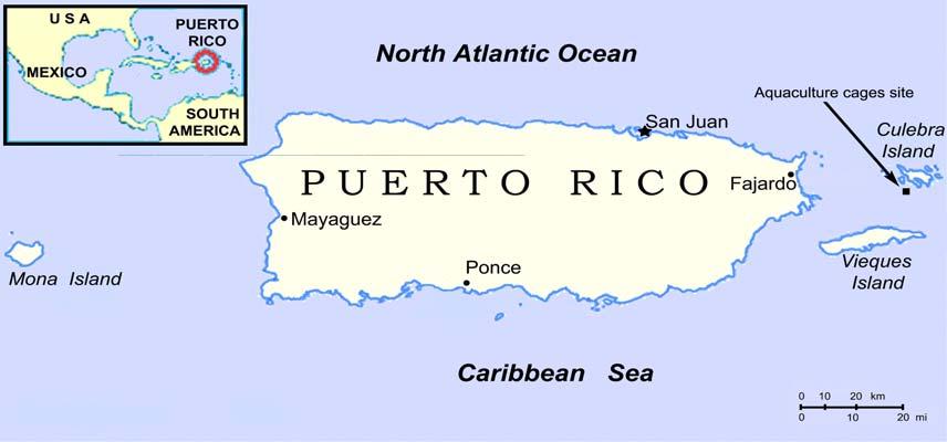 The Puerto Rico population generally prefers marine fish to those of freshwater; they especially prefer lighter colored fish or those with a reddish color. As an island, Puerto Rico should benefit from its location, surrounded by the Atlantic Ocean and the Caribbean Sea, and should have competitive fisheries production. Because the island is small and crowded with 3.9 million inhabitants, the terrestrial environment has been heavily impacted. Large expanses of land are occupied by many private and commercial activities, including housing, commercial centers, industrial areas, and highways (López-Feliciano 1999). The complex infrastructure has resulted in deforestation, soil erosion, water pollution, and air pollution. There are few tracts of land suitable for aquaculture purposes, leaving room only for efficient land-based freshwater or marine aquaculture operations. Open-ocean submerged cage aquaculture is a new technology promising high yields of fresh seafood, which may help supply part of the seafood demand.
