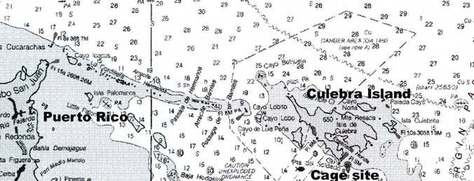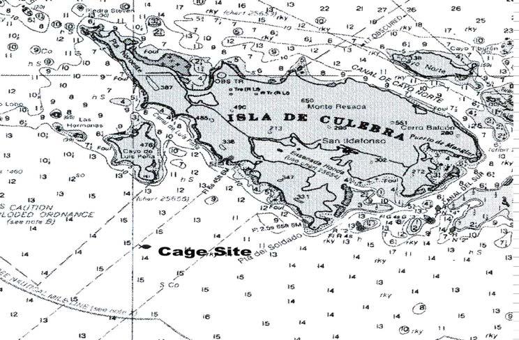 Bathymetry data were taken from the most recent bathymetry charts of the area near Culebra, Puerto Rico, and corroborated by depth soundings at the cage