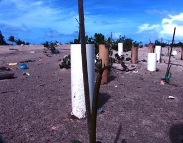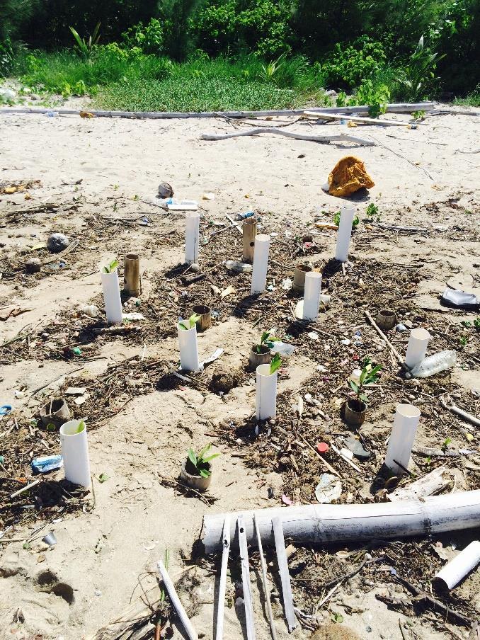 On March 4th 2016, we returned to the plots to remove the PVC tubes from around propagules before the propagules grew prop roots that would prevent their removal. We could remove most tubes. We poured water over the sand and propagules to permit the PVC tube to move around the propagule and then carefully, we twisted the tube back and forth until the tube could slide free of the propagule, resulting in minimal disturbance to propagule.