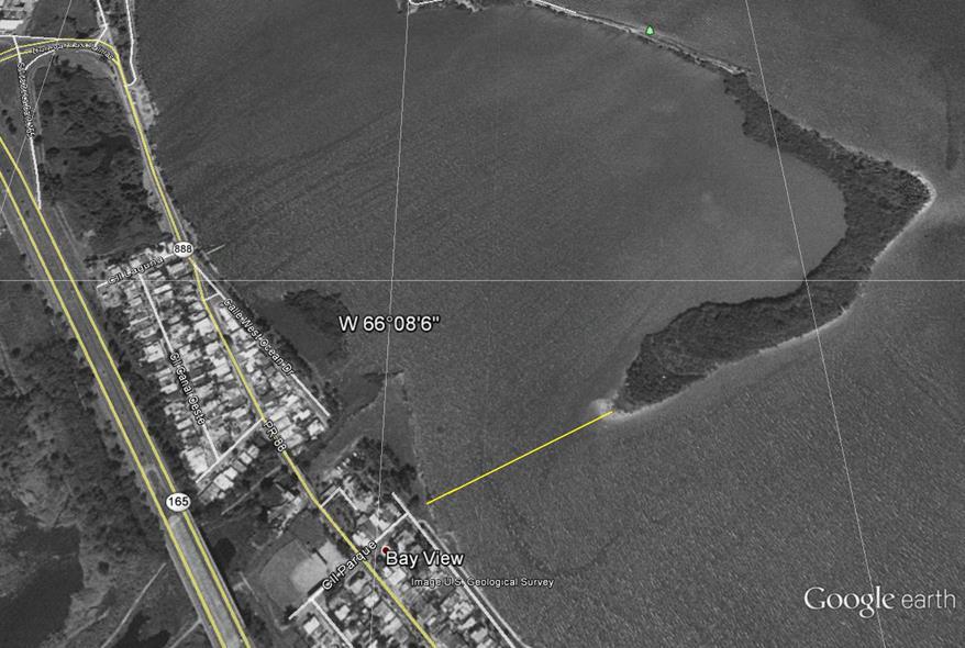 Another human made element helped change this coastal landscape even further. In the early 1980’s, dredged material from the San Juan Bay was deposited by the U.S. Army Corps of Engineers (USACE) near the shore across West Bay View. On 1982 topographic maps there is no sign of the deposited material. Though the past decades, sediments flowing into the area from Caño La Malaria and the dredged material of the bay created a sandbar that attached to the northwestern tip of the shore, trapping the incoming sediments and creating an island that enclosed the area. Eventually the USACE created two openings on the island and built ditches to keep them from closing. This resulted in twonew physical elements; a peninsula (laterdeveloped into Parque La Esperanza), and an island that has been growing by accretion and is reaching the shore. Its northern shore is subject to high wind and currents, making it difficult for mangroves to grow. But there is an area of lower energy that has accrued and created an additional, but smaller peninsula in the leeward side of Parque La Esperanza. That is the study area where mangrove experimentation techniques took place for the ecological component of this research (Figure 8).