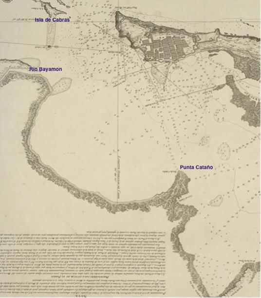 An examination of earlier maps dating from a Spanish colonial period illustrate a completely different coastline of the study area. The map from Cosme de Churruca (1794) unveils an intact area of Cataño, were Isla de Cabras was only an outcrop of rocks (possibly coral rubble) guarding the entrance of the San Juan Bay. La Esperanza peninsula was nonexistent, with a coastline possiblyforestedbymangroves(Figure4). However,lessthan100yearslater,thehumanfootprint is evident. A later map from Roldan y Navarro dating from 1887 shows a small village settled on a portion of the shore of Cataño, south of what todayis Bay View. There are two elements present in both maps; the Bayamón River and Punta de Cataño, without major changes. However, on the 1887 map,it appearsthat theshorelinewas mainlyasandybeach with no signs ofmangroveforest. A possible explanation for this is that the Spanish government had policy that encouraged the elimination of mangroves. In 1873, the governor approved an ordinance allowing people to settle legallyiftheycleared mangroves, filledthewetlands andbuiltstructures on coastal land(Seguinot, 1997). Needless to say, that policy enticed the modification of the coastline along the Bay of San Juan, destroying ecological systems and altering the drainage patterns. That map also depicts in detail intense agricultural activity, surrounding the western portion of Cienaga Las Cucharillas. The abundance of surface water was evident, and water canals, probably used for irrigation or to drain the area, can be seen on that map (Figure 5)